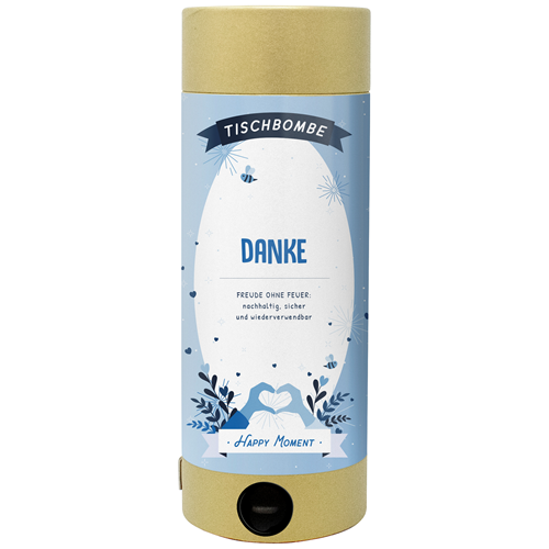 Die Tischbombe ist mit einem vorgefertigten Danke-Design bedruckt.