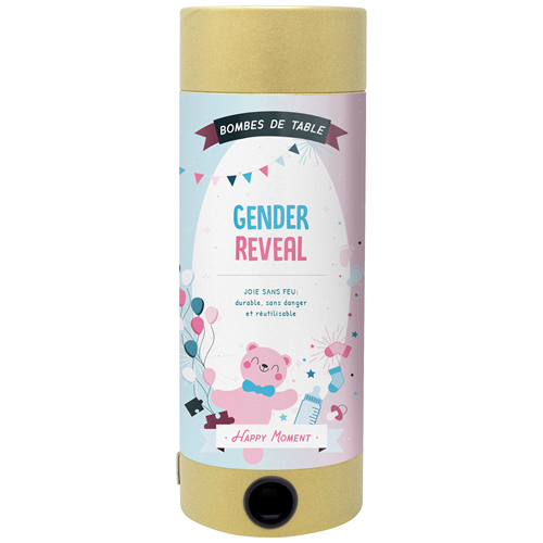 Die Tischbombe ist mit einem vorgefertigten Gender reveal Boy-Design bedruckt.